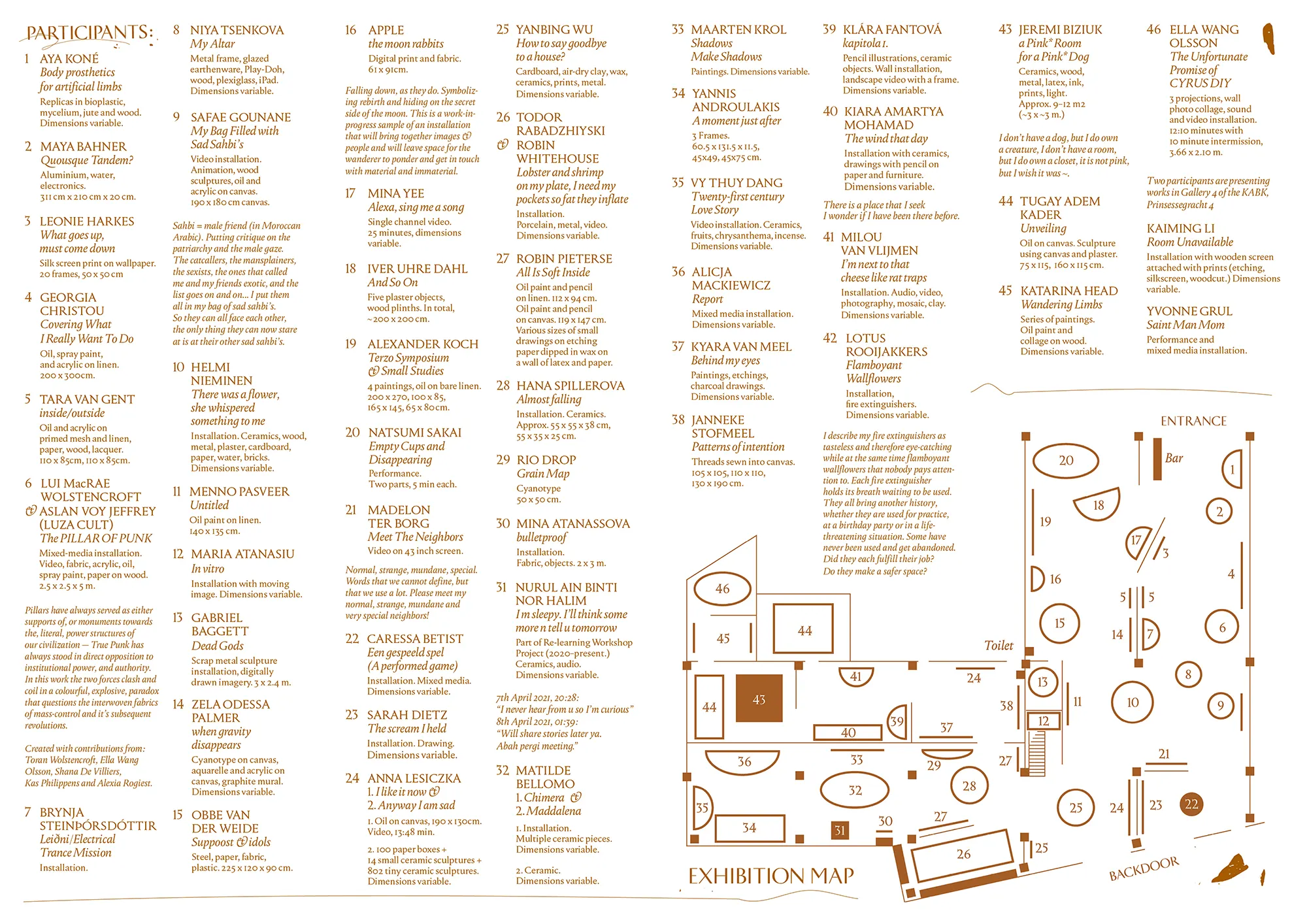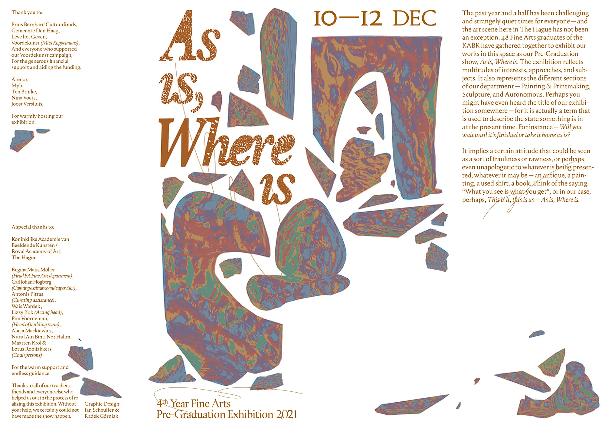 "The exhibition reflects multitudes of interests, approaches, and subjects. It also represents the different sections of our department – Painting & Printmaking, Sculpture, and Autonomous. Perhaps you might have even heard the title of our exhibition somewhere – it's used to describe the state something is in at the present time. For instance – will you wait until it’s finished or take it home as is?"